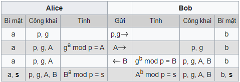 - Alice chọn một số nguyên bí mật a=6, và gửi cho Bob giá trị A = ga mod p
