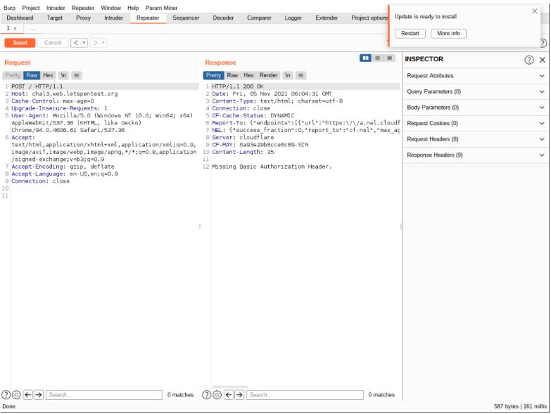 - Lúc này nó yêu cầu xác minh, dễ thấy chìa khóa mình đã lấy được ở phần GET rồi giờ tìm cách gửi đi là xong, mình search gg với key word là Basic Authentication Credential thì ra được cấu trúc