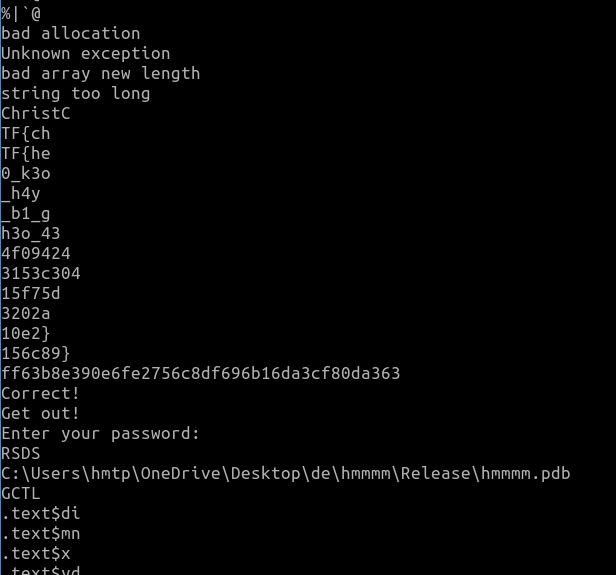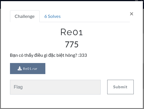Mình dùng strings grep chuỗi là ra. ($ strings Re01.exe)