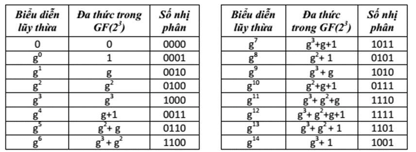 Ví dụ, xét trường GF(2m) với đa thức tối giản là m(x) = x4 + x + 1. Phần tử sinh g của trường này có điều kiện g4 = g +1. Bảng các lũy thừa của g là: