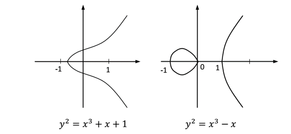 Hình dưới minh họa hai đường cong Elliptic y2= x3 –x và y2=x3 + x + 1