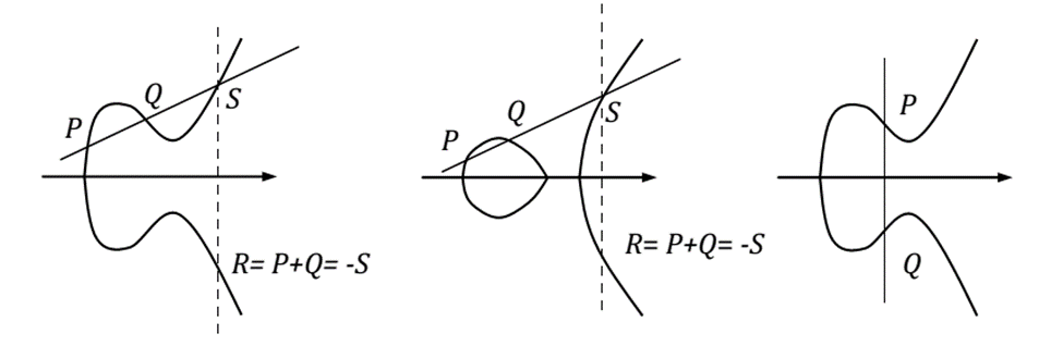 - Với 2 điểm P, Q bất kỳ, kẻ một đường thẳng đi qua P và Q thì sẽ cắt đường cong Elliptic tại một điểm thứ 3 là điểm S. Phép cộng P và Q sẽ là
