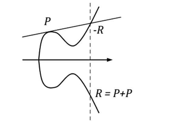 - Để tính P + P , ta vẽ đường thẳng tiếp tuyến với đường cong Elliptic tại P , đường thẳng này cắt đường cong tại điểm S, lúc đó R= P + P= -S.