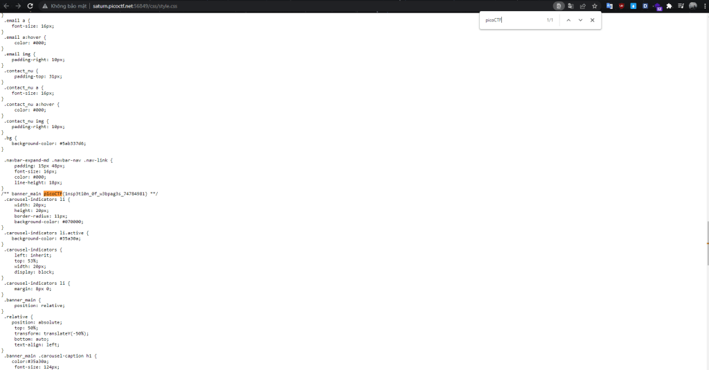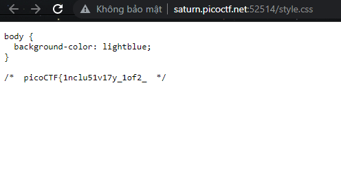 - Nhìn vào source code thì thấy có vẻ như là flag không nằm trong file gốc, nhìn qua thì thấy file css đầu không có khả năng chứa flag nên mình check từ file css thứ 2, và đến file css thứ 3 thì được flag