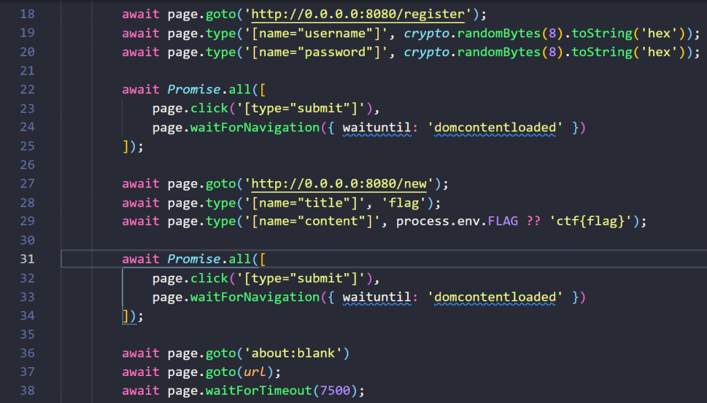 - Sau khi đọc source code thì thấy mỗi lần gửi report thì server sẽ chuyển đến địa chỉ local là http://0.0.0.0:8080 rồi sau đó đăng kí một tài khoản được random ngẫu nhiên và tạo một note mới chính là flag cần tìm, sau đó thì mới chuyển đến url mà người dùng truyền vào