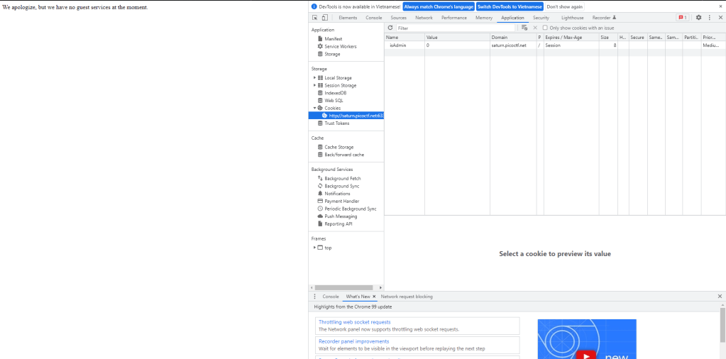 - Đề bài của chall này có gợi ý liên quan đến cookie, ban đầu mình kiểm tra thì chưa có gì, sau khi click vào button trên thì có 1 cookie được khởi tạo
