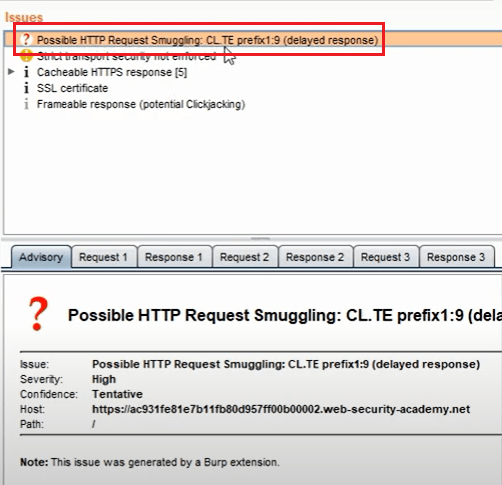 Khi thực hiện thực hiện tương tác với website, extension HTTP Request Smuggler sẽ chủ động check lỗi cho từng request để tìm ra lỗ hổng này.