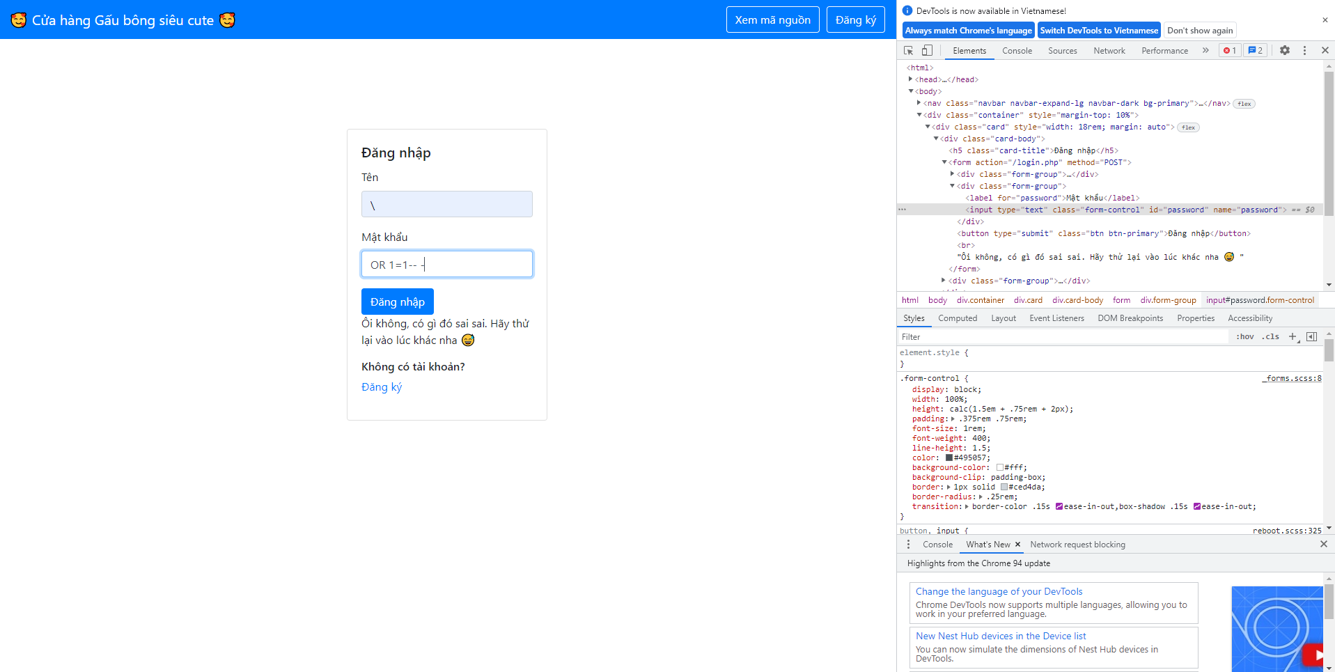 - Có thể các bạn chưa biết thì \’ sẽ làm nháy đơn đó bị vô hiệu hóa hoàn toàn. Và thế là ta có thể thoải mái đưa câu lệnh injection hợp lệ vào ô password mà không cần truyền vào nháy đơn như thường lệ, mình chỉnh type thành text cho dễ nhìn