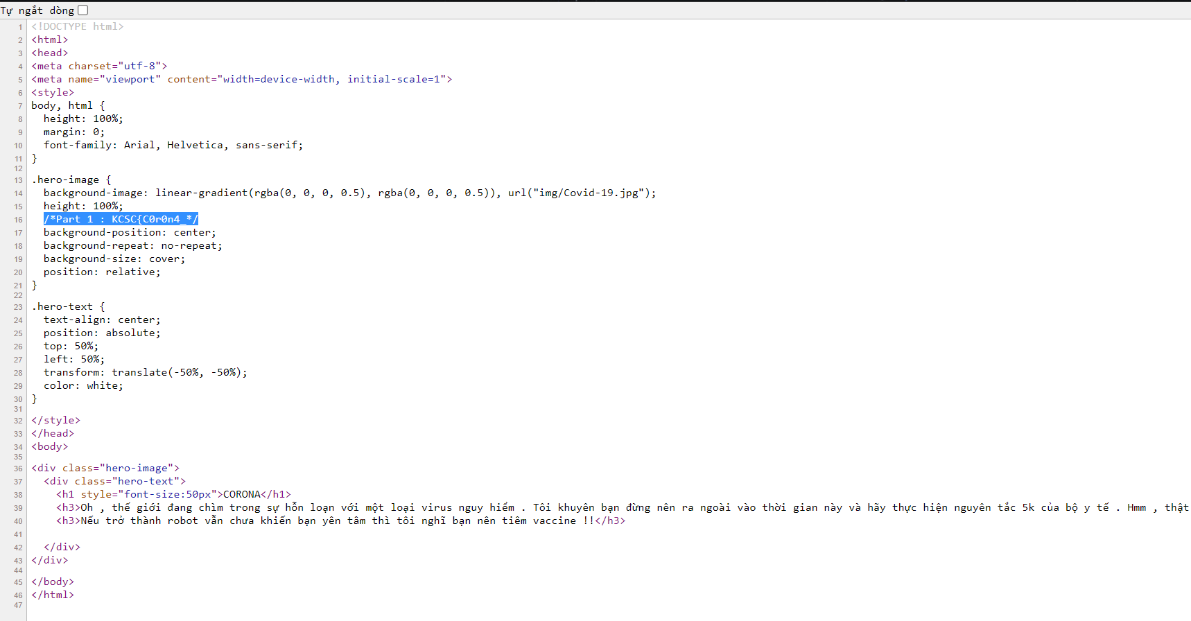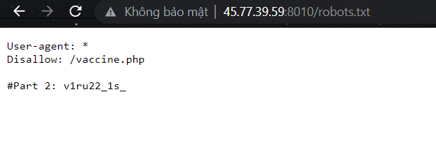 Part 1 : KCSC{C0r0n4_- Tiếp theo như tựa đề bài là ROBOT mình nghĩ ngay đến tệp trùng tên là robots.txt và được part2
