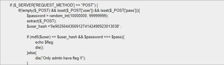 - Cũng nghiệt ngã phết, sau một thời gian dài loay hoay thì mình tìm biết được rằng dạng 0e trong php có nghĩa là 0 mũ vậy nên kết quả sẽ là so sánh user hash bằng thuật toán md5 với 0, vậy cần tìm một chuỗi hash ra kí tự bắt đầu bằng 0e là được