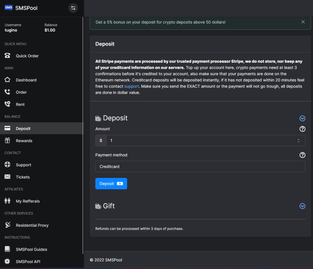 Bước 2: Đăng nhập và truy cập đến Deposit, nhập số tiền và chọn CreditCard rồi ấn Deposit. (Ở đây mình nạp 1 đô)
