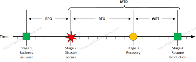 MTD là viết tắt của Maximum Tolerable Downtime (MTD), là thời gian tối đa cho phép từ lúc xảy ra sự cố cho đến khi hệ thống được hoạt động bình thường. Chỉ số này có ý nghĩa, làm gì thì làm, từ thời điểm xảy ra sự cố, thực hiện phục hồi dữ liệu và verify lại dữ liệu, phải thấp hơn MTD đã đưa ra từ trước. Công thức là: