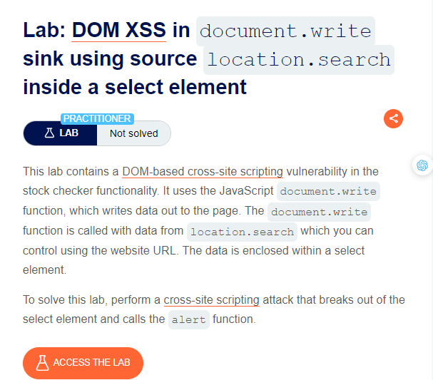 Lab 2: DOM XSS in source location.search to sink document.write trong một phần tử được chọn