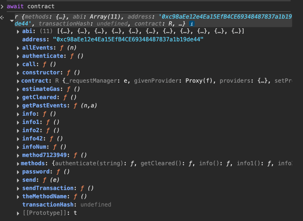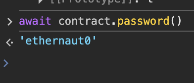 Câu đố muốn hỏi ta biêt password không để xác thực, hãy lật ngược lại xem: chạy await contract -> có method password ở đây.